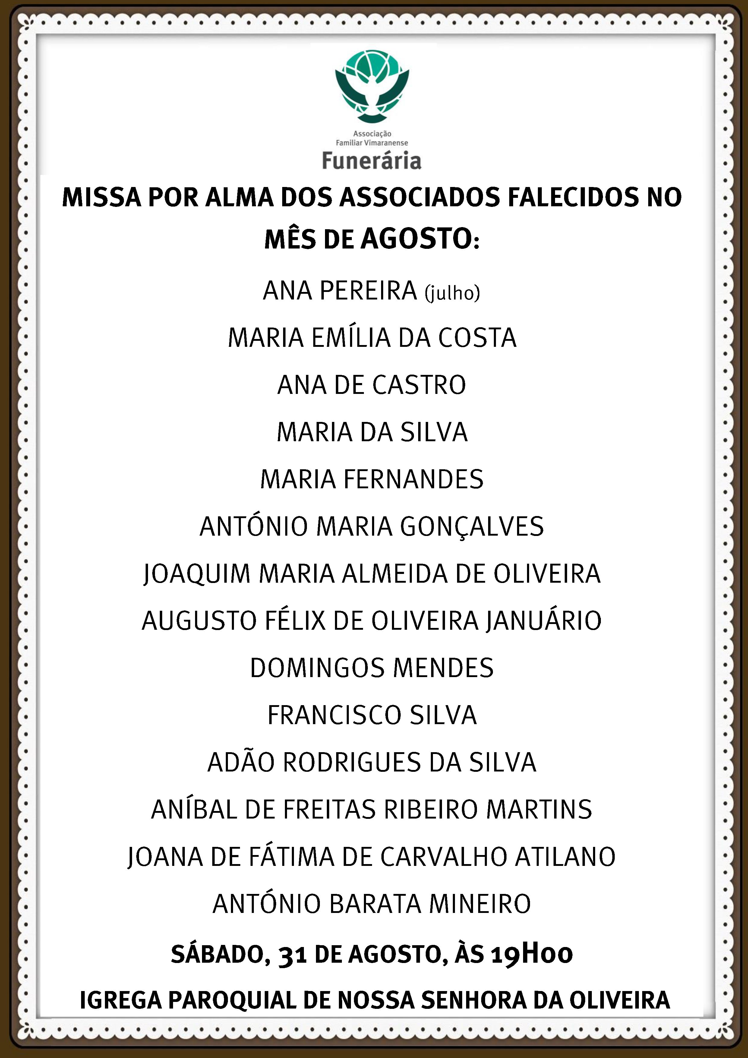 Missa por Alma dos Associados Falecidos no mês de Agosto/19