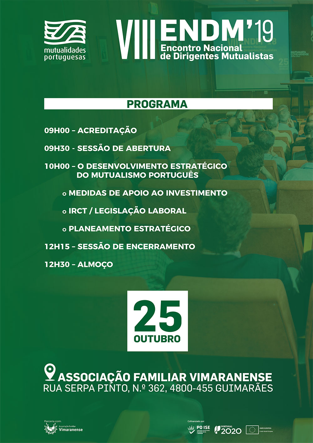 O Encontro Nacional de Dirigentes Mutualistas vai realizar-se no Salão Nobre da Associação de Socorros Mútuos Familiar Vimaranense (Rua Serpa Pinto, n.º 362, 4800-455 Guimarães).